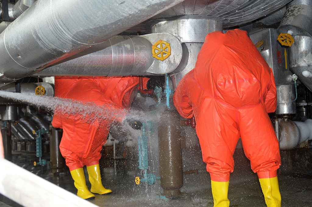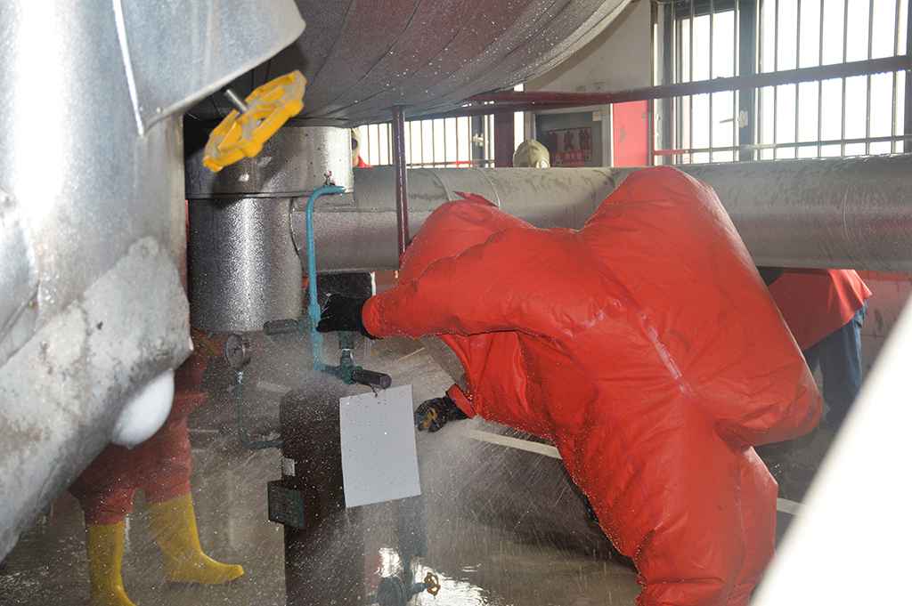 本次演练以开机降温过程中,2#低压循环桶集油器处突发氨气泄漏为场景,各操作人员按照预案,穿戴好相关防护用品,相互配合,对泄漏处进行了快速、有效地的现场处置,演练从实战出发,整个过程有条不紊。